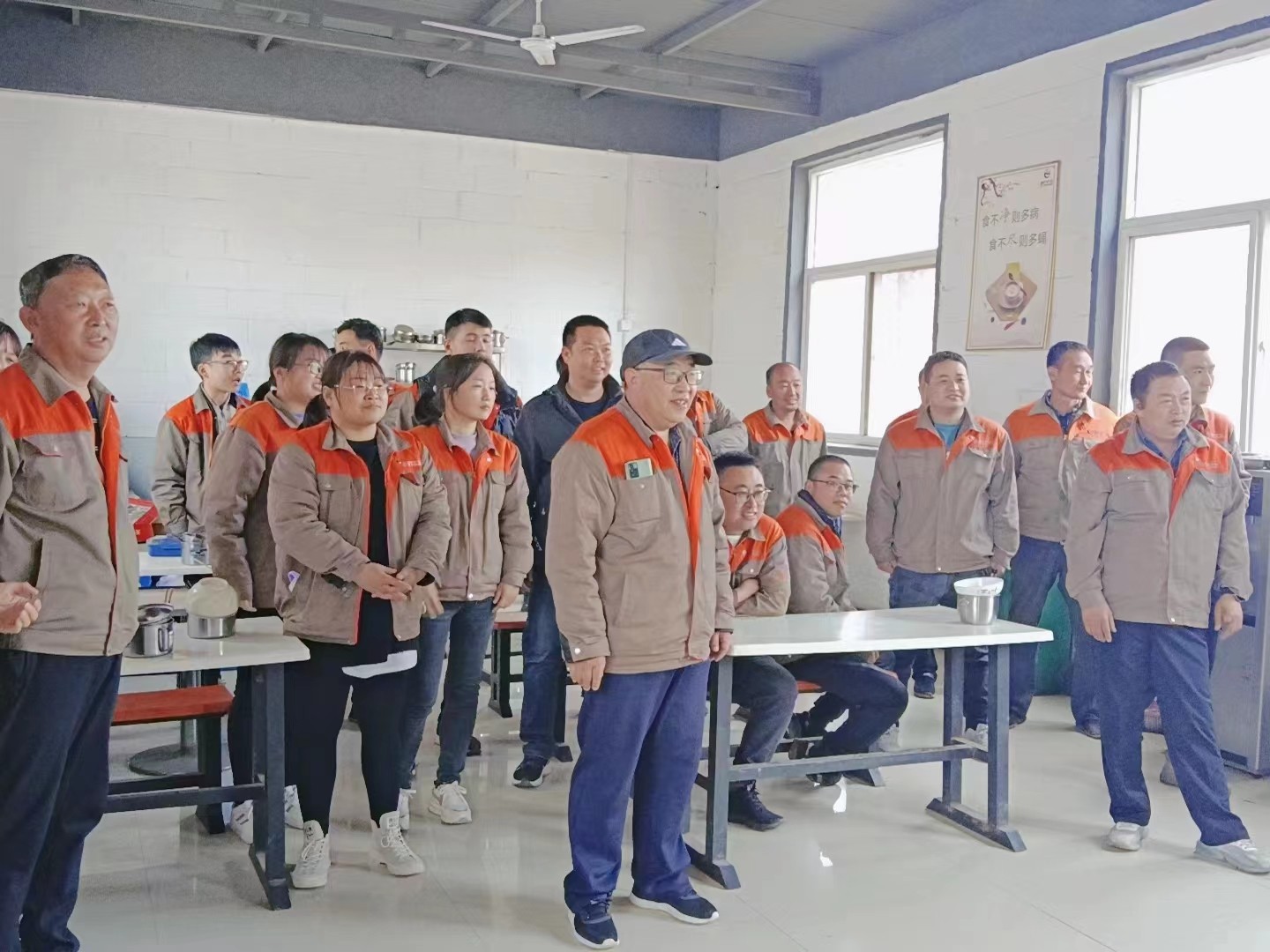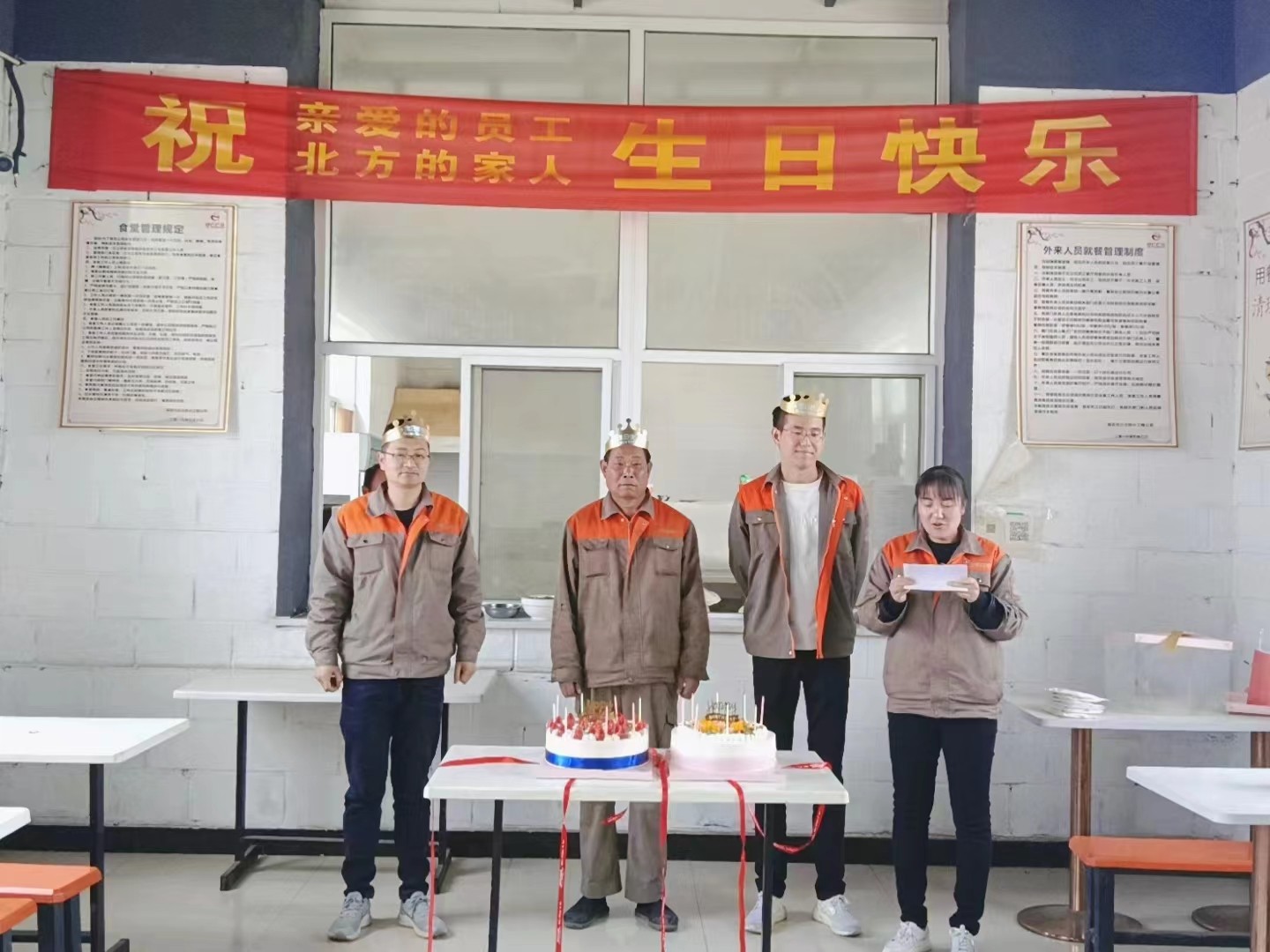 公司食堂準備了豐盛可口的飯菜,公司準備了生日蛋糕,董事長發表講話,并為過生日的同志送上生日祝福,公司員工聚在一起唱生日歌,分享生日蛋糕。大家都覺得十分幸福,因為我們是相親相愛一家人